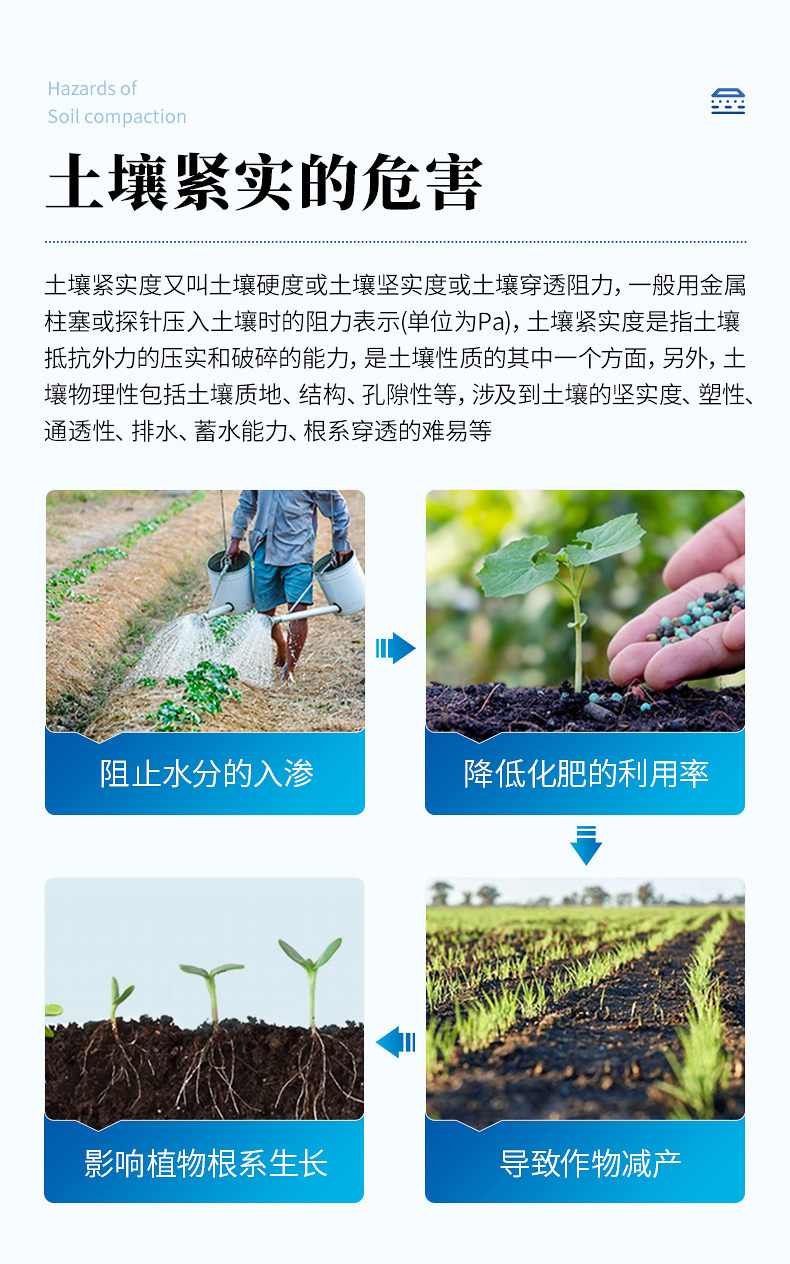 土壤緊實(shí)度又叫土壤硬度或土壤堅(jiān)實(shí)度或土壤穿透阻力。一般用金屬柱塞或探針壓入土壤時的阻力表示(單位為Pa)。土壤緊實(shí)度是指土壤抵抗外力的壓實(shí)和破碎的能力,是土壤性質(zhì)的其中一個方面。另外,土壤物理性包括土壤質(zhì)地、結(jié)構(gòu)、孔隙性等,涉及到土壤的堅(jiān)實(shí)度、塑性、通透性、排水、蓄水能力、根系穿透的難易等。