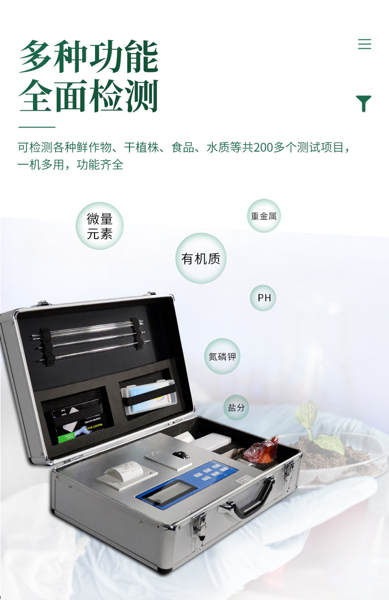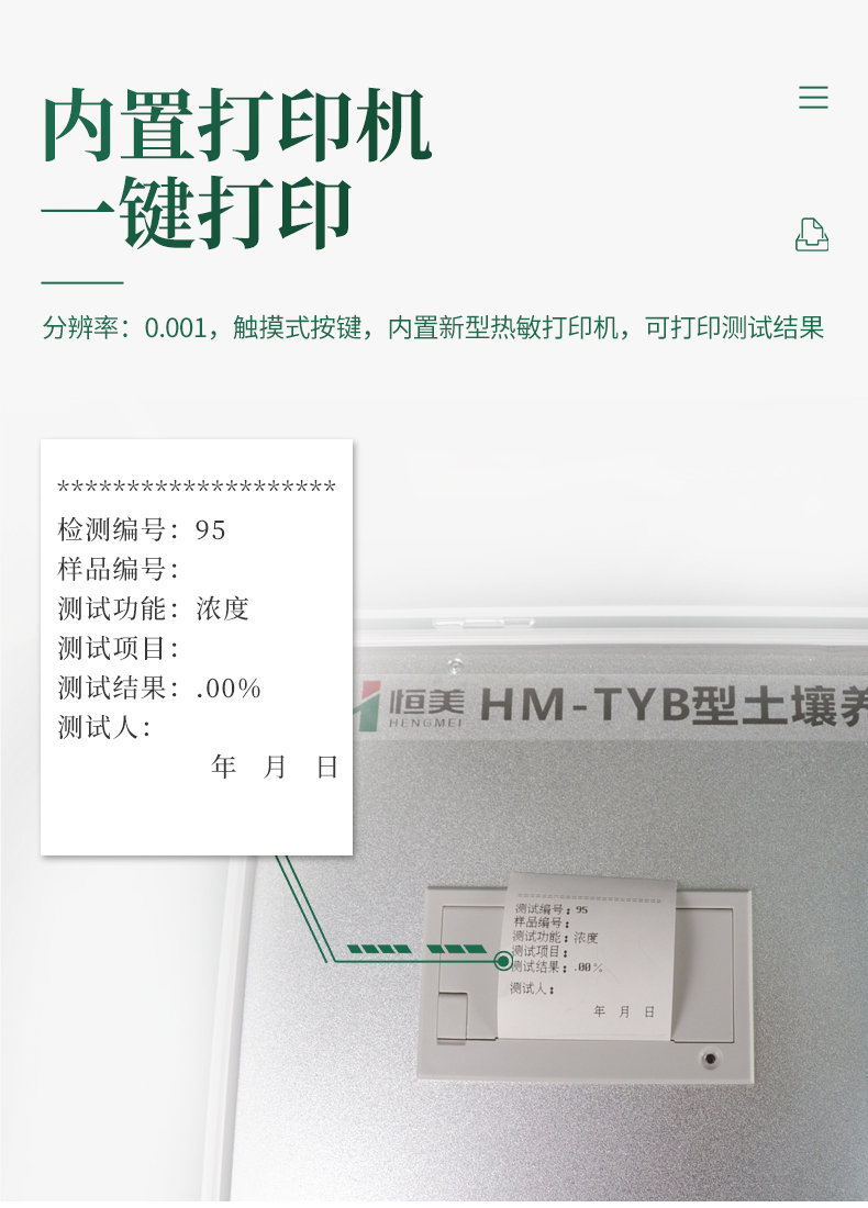 (!配套性好,內(nèi)置鋰電池,打印機,及測試用到的所有配件, 保證用戶只需提供純凈水即可完成氮磷鉀有機質(zhì)pH含鹽量的準確測定?。?nbsp;