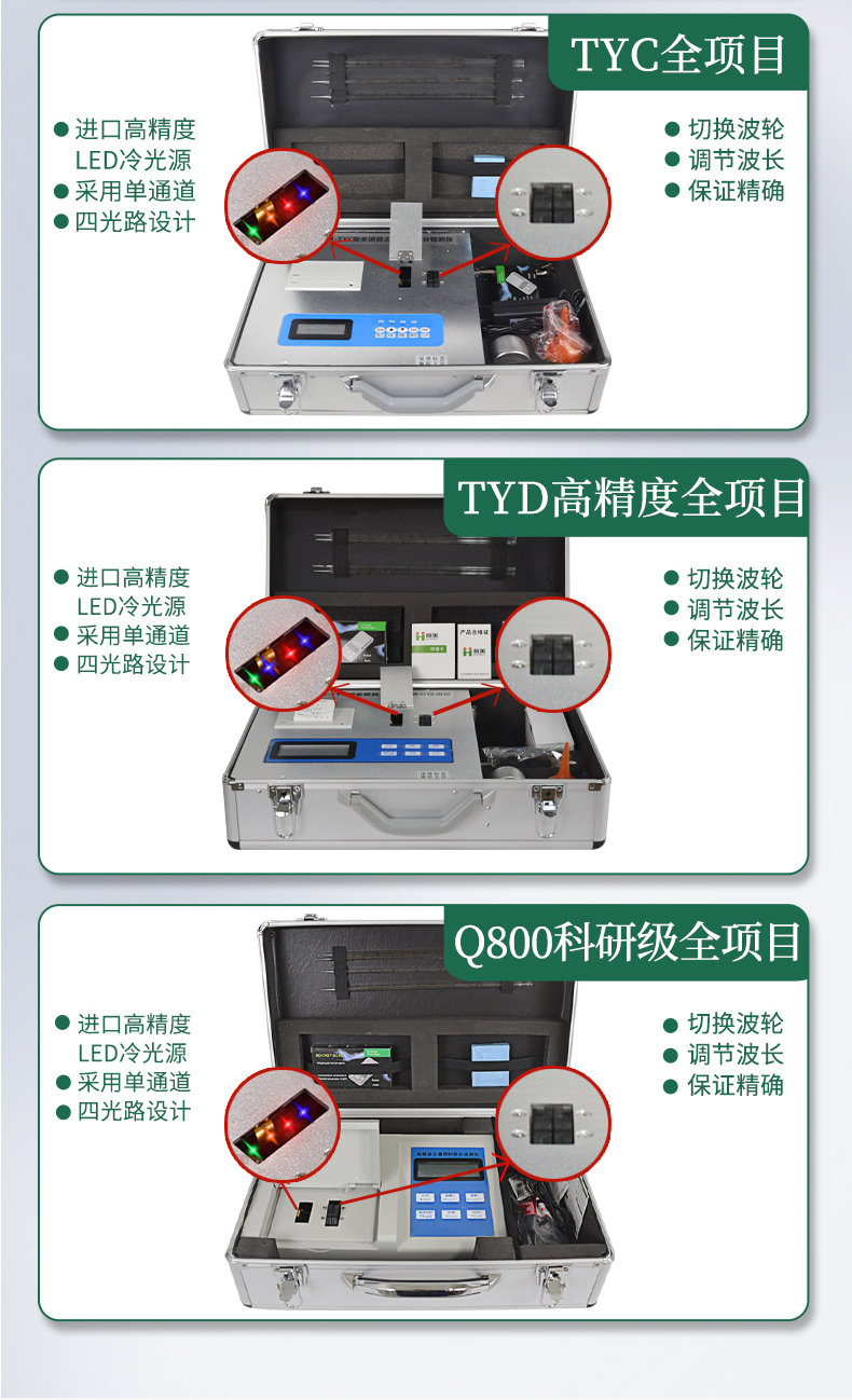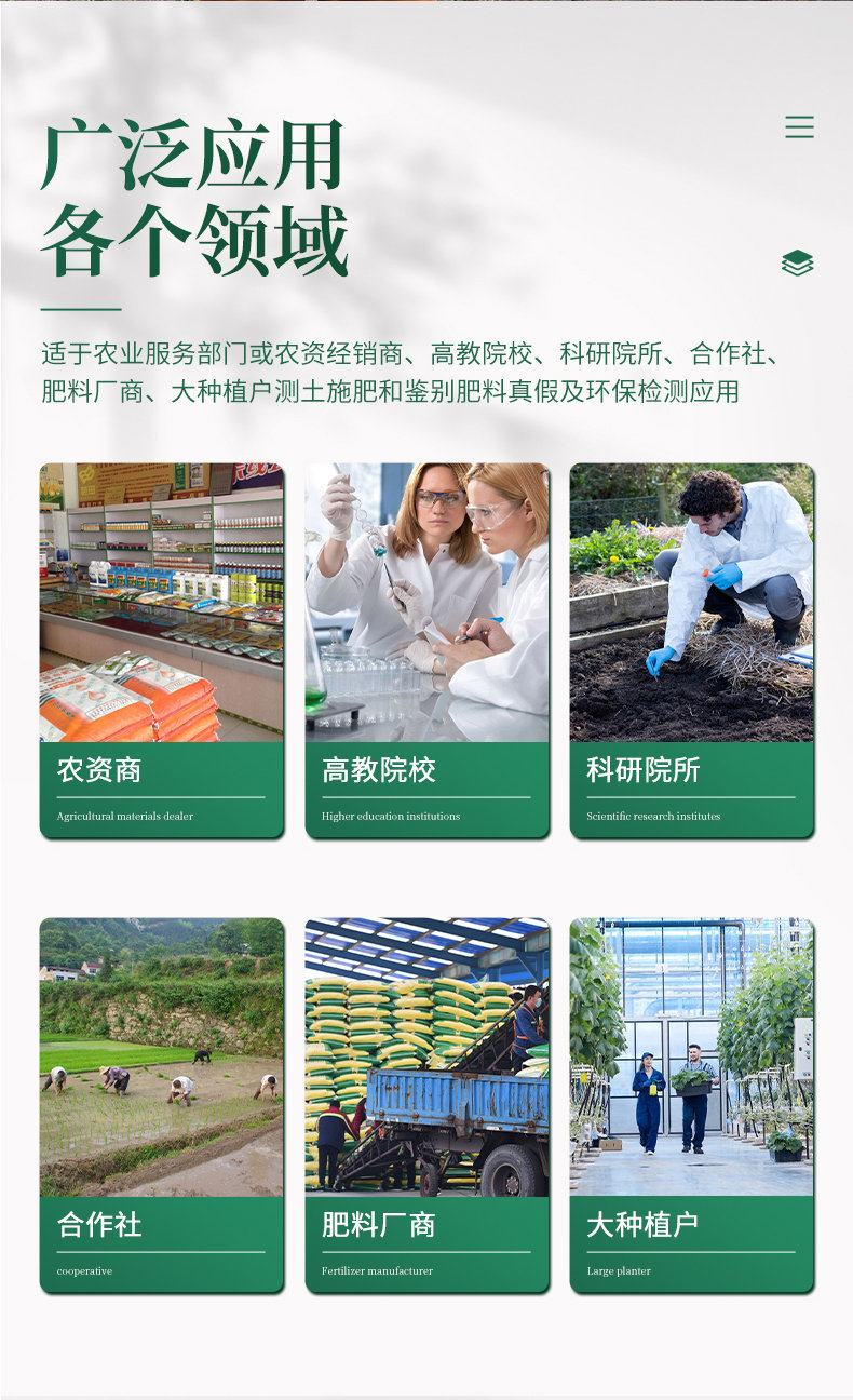 肥料養(yǎng)分:● 單質(zhì)化肥中的氮、磷、鉀; ● 復(fù)(混)合肥及尿素中的銨態(tài)氮、磷、鉀; ● 有機肥中速效氮、速效磷、速效鉀、全氮、全磷、全鉀、pH、有機質(zhì)等。