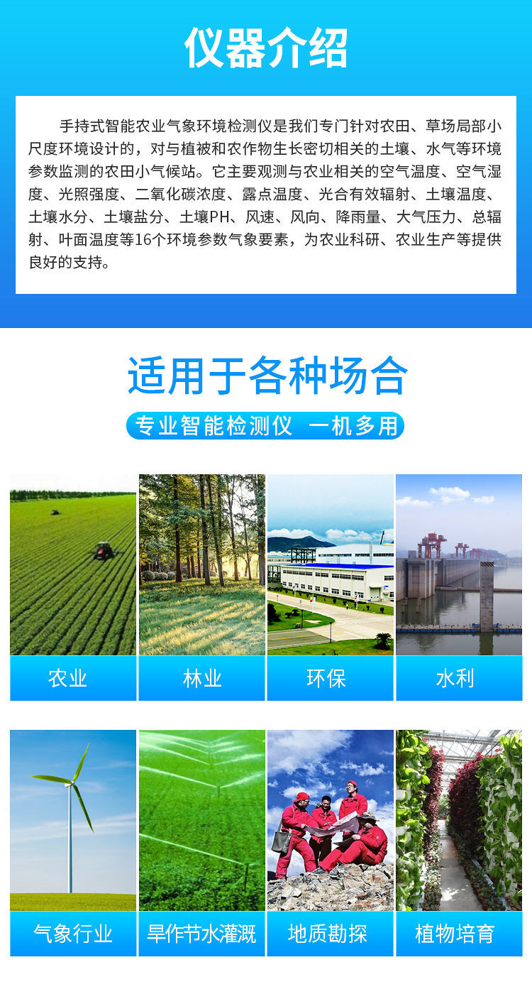 農(nóng)業(yè)環(huán)境監(jiān)測儀是我們專門針對農(nóng)田、草場局部小尺度環(huán)境設(shè)計(jì)的,對與植被和農(nóng)作物生長密切相關(guān)的土壤、水氣等環(huán)境參數(shù)監(jiān)測的農(nóng)田小氣候站。它主要觀測與農(nóng)業(yè)相關(guān)的空氣溫度、空氣濕度、光照強(qiáng)度、二氧化碳濃度等4個環(huán)境參數(shù)氣象要素,為農(nóng)業(yè)科研、農(nóng)業(yè)生產(chǎn)等提供良好的支持。